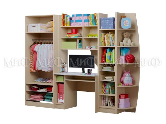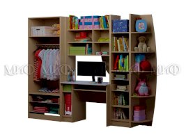 Набор детской мебели со столом. Изготовлен с соблюдением всех необходимых требований к экологичности и функциональности. В этой модели детской модульной мебели использована крепкая и надежная фурнитура.