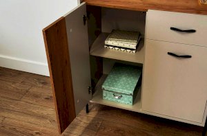 С другой стороны комод оборудован выкатным ящиком, который обеспечивает легкий доступ к часто используемым предметам. Под ним расположен большой глухой фасад, скрывающий за собой просторное хранилище для более крупных вещей.