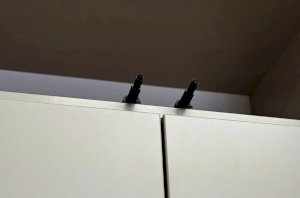 Особое внимание заслуживает фрезеровка фасадов, которая придаёт антресоли изысканный вид. Толкатели PUSH вместо ручек обеспечивают удобное открывание нажатием.